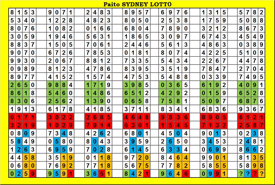 Perhatian! Data Paito Harian Sydney Lotto Diambil dari website livedraw : disini. Jika ada kekeliruan data didalam paito, harap merujuk ke sumber asli masing-masing game.