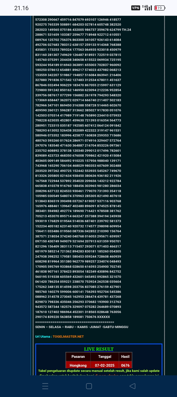 MASTER HONGKONG Sabtu, 14-02-2026 Merupakan Prediksi Otomatis yang menggabungkan Metode Kalender Togel Dengan Rumus-rumus kontrol yang sudah terbukti keakuratanya.Gunakan Aplikasi Rekap untuk mendapatkan LN TOP. Harap Maklum Jika kadang meleset MASTER HONGKONG kita. Jadikan ini sebagai perbandingan saja dan tetap UPS