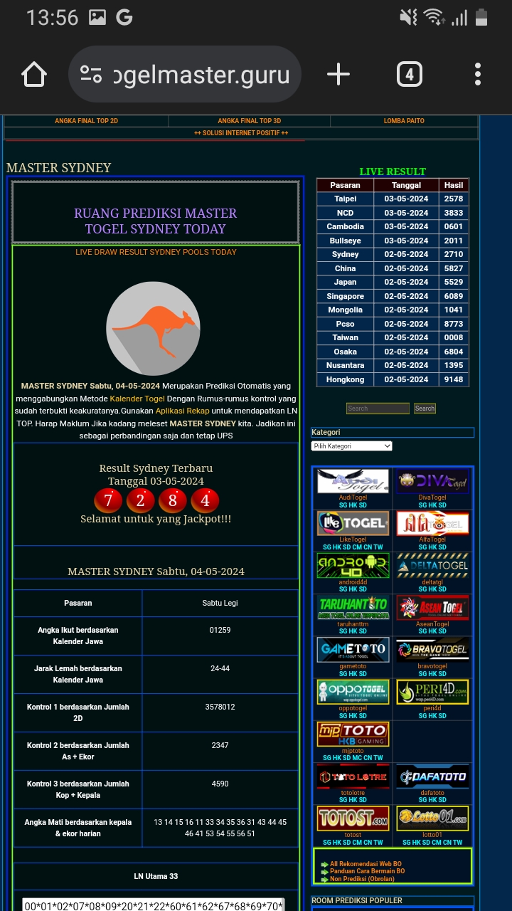 MASTER SYDNEY Minggu, 15-02-2026 Merupakan Prediksi Otomatis yang menggabungkan Metode Kalender Togel Dengan Rumus-rumus kontrol yang sudah terbukti keakuratanya.Gunakan Aplikasi Rekap untuk mendapatkan LN TOP. Harap Maklum Jika kadang meleset MASTER SYDNEY kita. Jadikan ini sebagai perbandingan saja dan tetap UPS