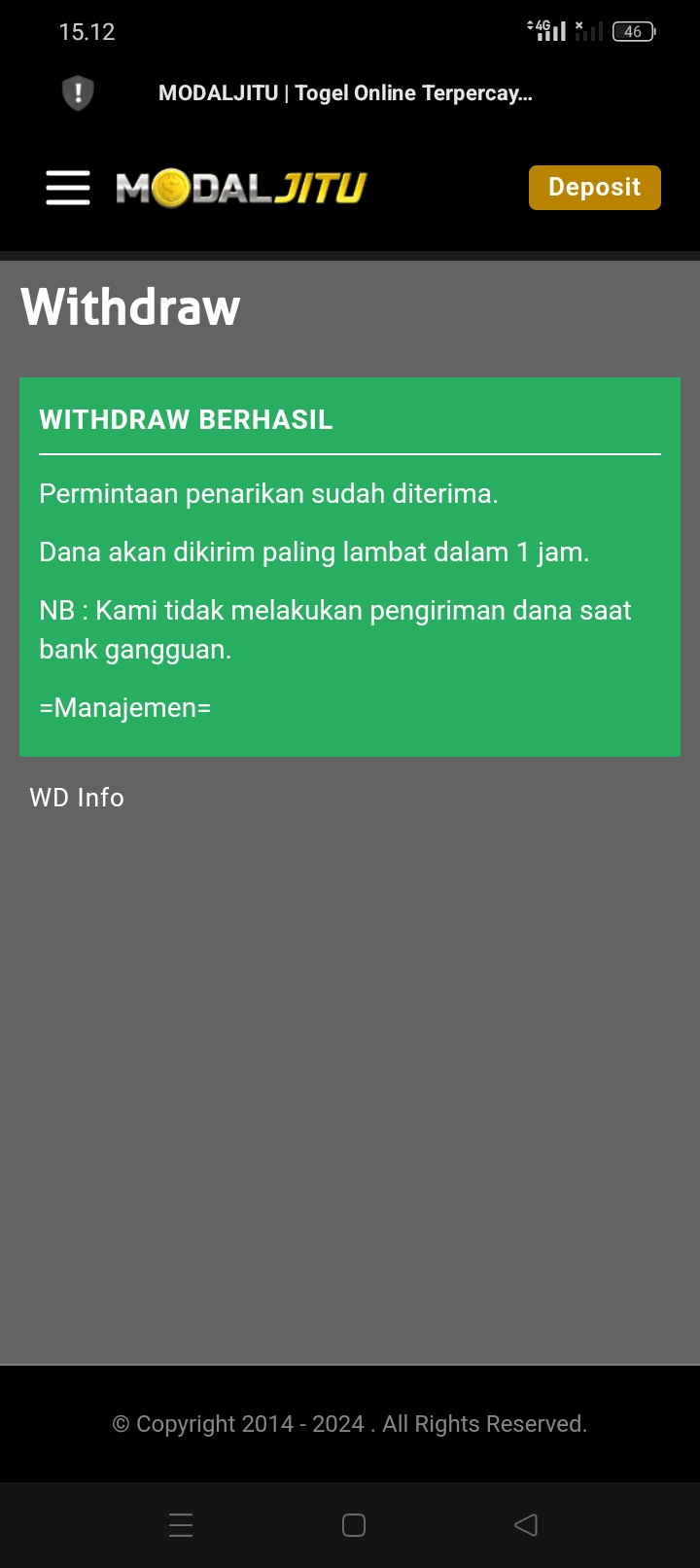 Apa ad yg main di modal jitu saya dpt ..wd 48,500,000 td di bayar di blg betingan GK wajar..padal pas wd di blg paling lambat 1jm