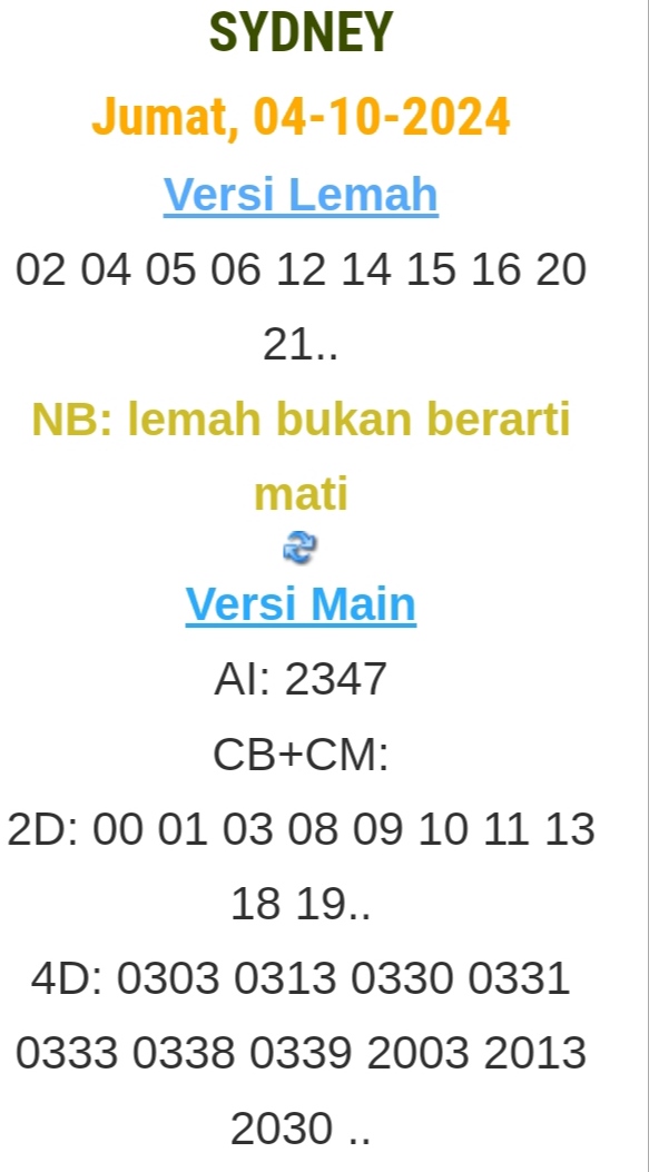 MASTER SYDNEY Sabtu, 14-02-2026 Merupakan Prediksi Otomatis yang menggabungkan Metode Kalender Togel Dengan Rumus-rumus kontrol yang sudah terbukti keakuratanya.Gunakan Aplikasi Rekap untuk mendapatkan LN TOP. Harap Maklum Jika kadang meleset MASTER SYDNEY kita. Jadikan ini sebagai perbandingan saja dan tetap UPS
