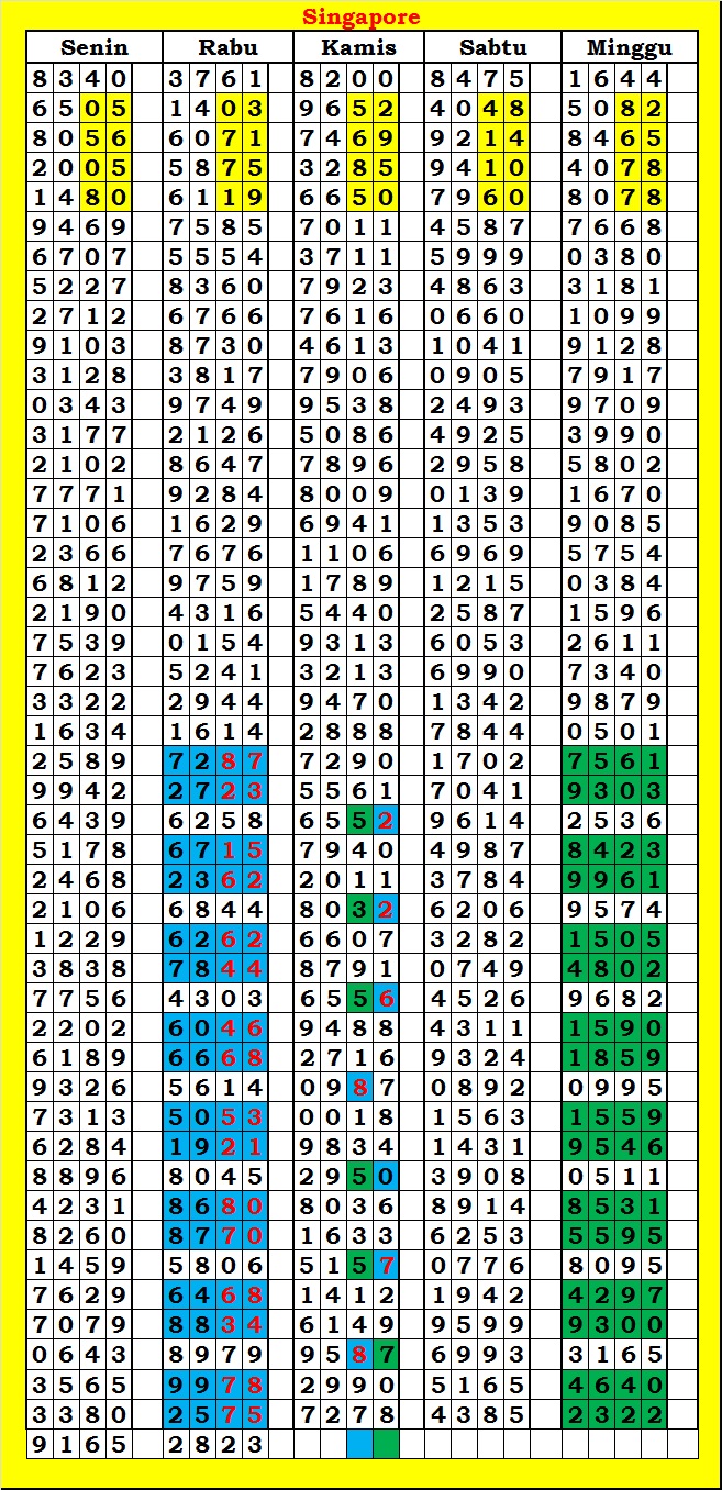 MASTER SINGAPURA Kamis, 19-02-2026 Merupakan Prediksi Otomatis yang menggabungkan Metode Kalender Togel Dengan Rumus-rumus kontrol yang sudah terbukti keakuratanya.Gunakan Aplikasi Rekap untuk mendapatkan LN TOP. Harap Maklum Jika kadang meleset MASTER SINGAPURA kita. Jadikan ini sebagai perbandingan saja dan tetap UPS