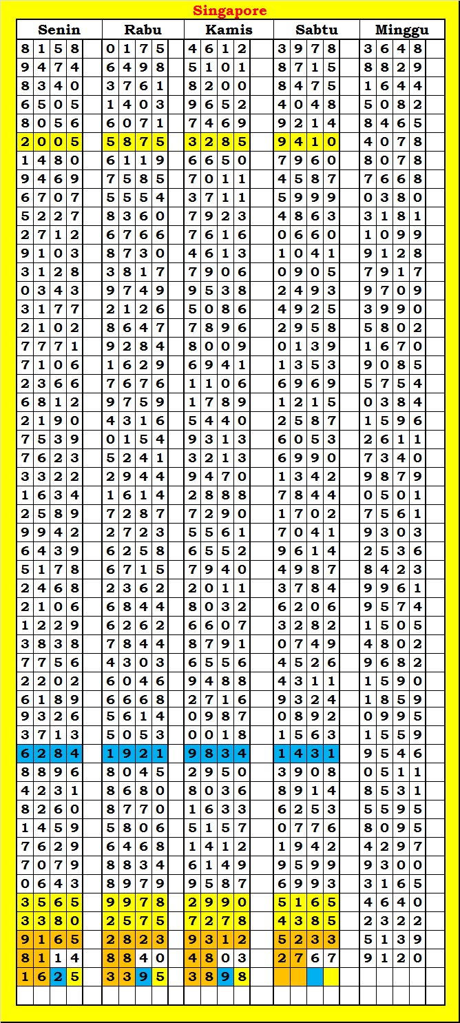 MASTER SINGAPURA Kamis, 19-02-2026 Merupakan Prediksi Otomatis yang menggabungkan Metode Kalender Togel Dengan Rumus-rumus kontrol yang sudah terbukti keakuratanya.Gunakan Aplikasi Rekap untuk mendapatkan LN TOP. Harap Maklum Jika kadang meleset MASTER SINGAPURA kita. Jadikan ini sebagai perbandingan saja dan tetap UPS