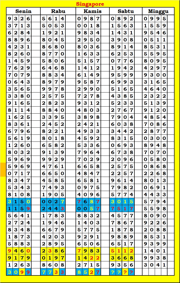 MASTER SINGAPURA Senin, 16-02-2026 Merupakan Prediksi Otomatis yang menggabungkan Metode Kalender Togel Dengan Rumus-rumus kontrol yang sudah terbukti keakuratanya.Gunakan Aplikasi Rekap untuk mendapatkan LN TOP. Harap Maklum Jika kadang meleset MASTER SINGAPURA kita. Jadikan ini sebagai perbandingan saja dan tetap UPS