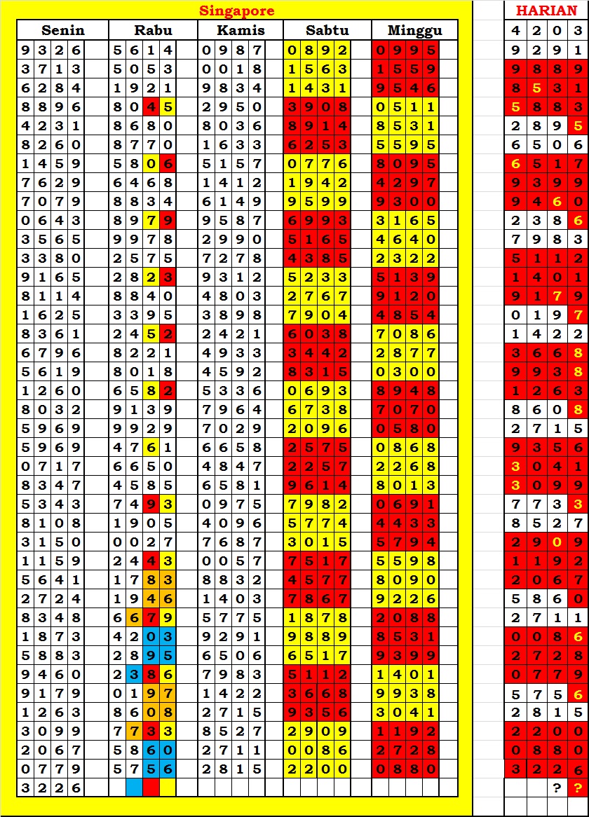 MASTER SINGAPURA Senin, 16-02-2026 Merupakan Prediksi Otomatis yang menggabungkan Metode Kalender Togel Dengan Rumus-rumus kontrol yang sudah terbukti keakuratanya.Gunakan Aplikasi Rekap untuk mendapatkan LN TOP. Harap Maklum Jika kadang meleset MASTER SINGAPURA kita. Jadikan ini sebagai perbandingan saja dan tetap UPS