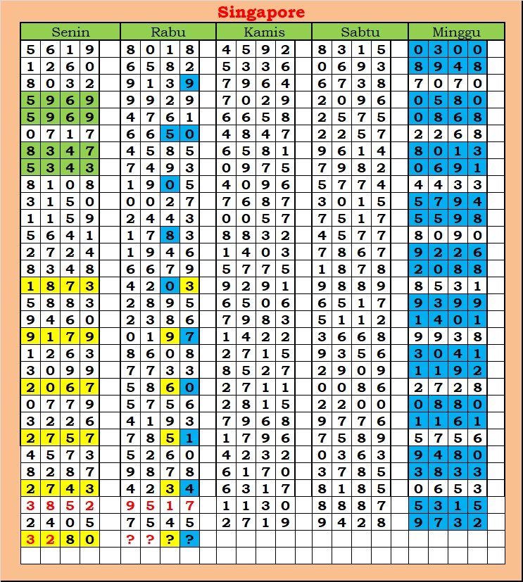 MASTER SINGAPURA Minggu, 15-02-2026 Merupakan Prediksi Otomatis yang menggabungkan Metode Kalender Togel Dengan Rumus-rumus kontrol yang sudah terbukti keakuratanya.Gunakan Aplikasi Rekap untuk mendapatkan LN TOP. Harap Maklum Jika kadang meleset MASTER SINGAPURA kita. Jadikan ini sebagai perbandingan saja dan tetap UPS