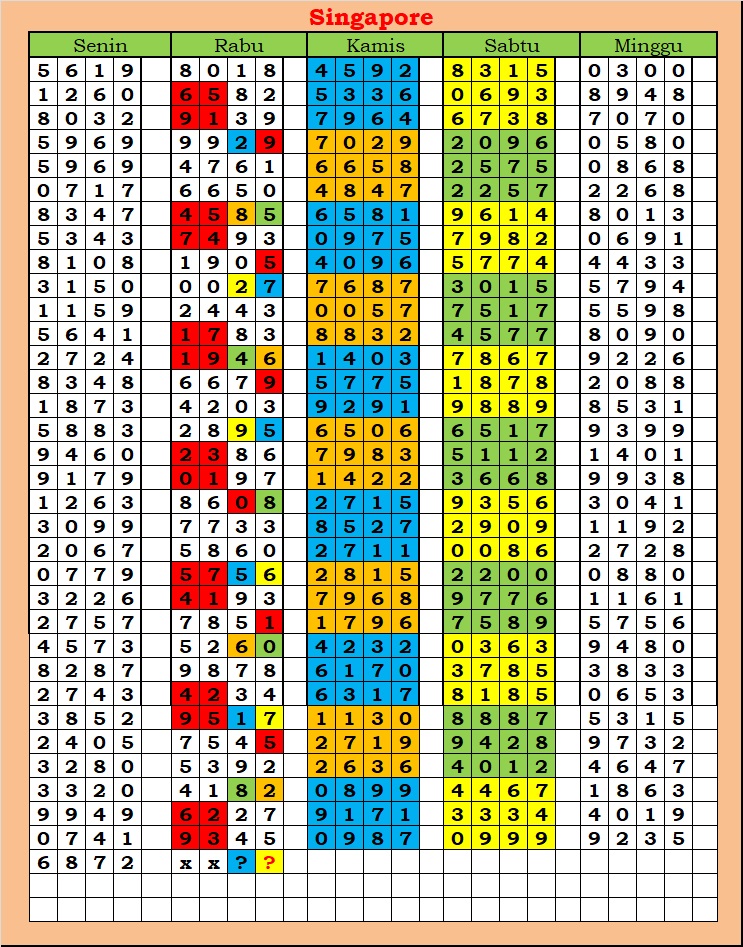 MASTER SINGAPURA Minggu, 15-02-2026 Merupakan Prediksi Otomatis yang menggabungkan Metode Kalender Togel Dengan Rumus-rumus kontrol yang sudah terbukti keakuratanya.Gunakan Aplikasi Rekap untuk mendapatkan LN TOP. Harap Maklum Jika kadang meleset MASTER SINGAPURA kita. Jadikan ini sebagai perbandingan saja dan tetap UPS