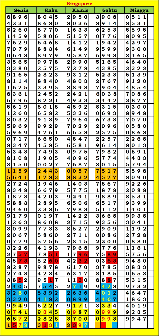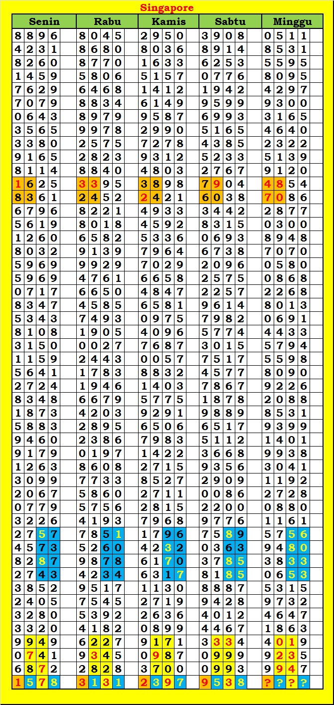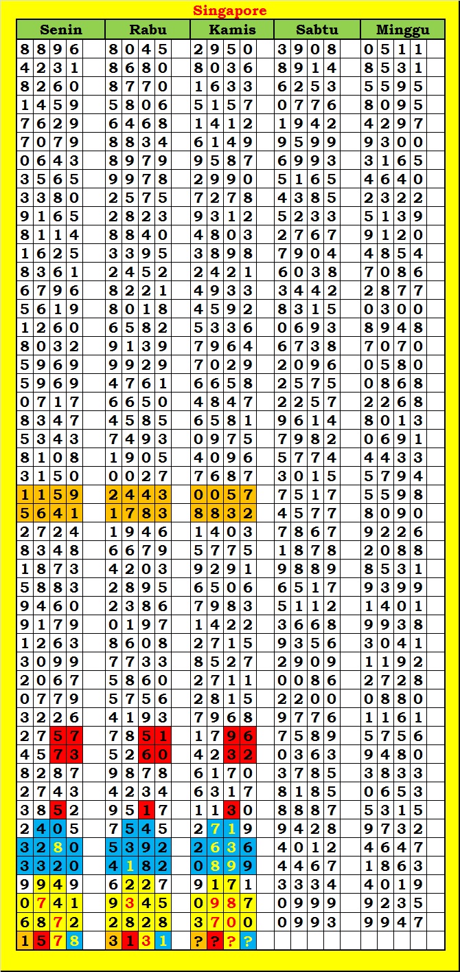 MASTER SINGAPURA Minggu, 15-02-2026 Merupakan Prediksi Otomatis yang menggabungkan Metode Kalender Togel Dengan Rumus-rumus kontrol yang sudah terbukti keakuratanya.Gunakan Aplikasi Rekap untuk mendapatkan LN TOP. Harap Maklum Jika kadang meleset MASTER SINGAPURA kita. Jadikan ini sebagai perbandingan saja dan tetap UPS