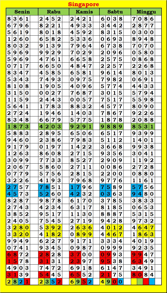 MASTER SINGAPURA Minggu, 15-02-2026 Merupakan Prediksi Otomatis yang menggabungkan Metode Kalender Togel Dengan Rumus-rumus kontrol yang sudah terbukti keakuratanya.Gunakan Aplikasi Rekap untuk mendapatkan LN TOP. Harap Maklum Jika kadang meleset MASTER SINGAPURA kita. Jadikan ini sebagai perbandingan saja dan tetap UPS