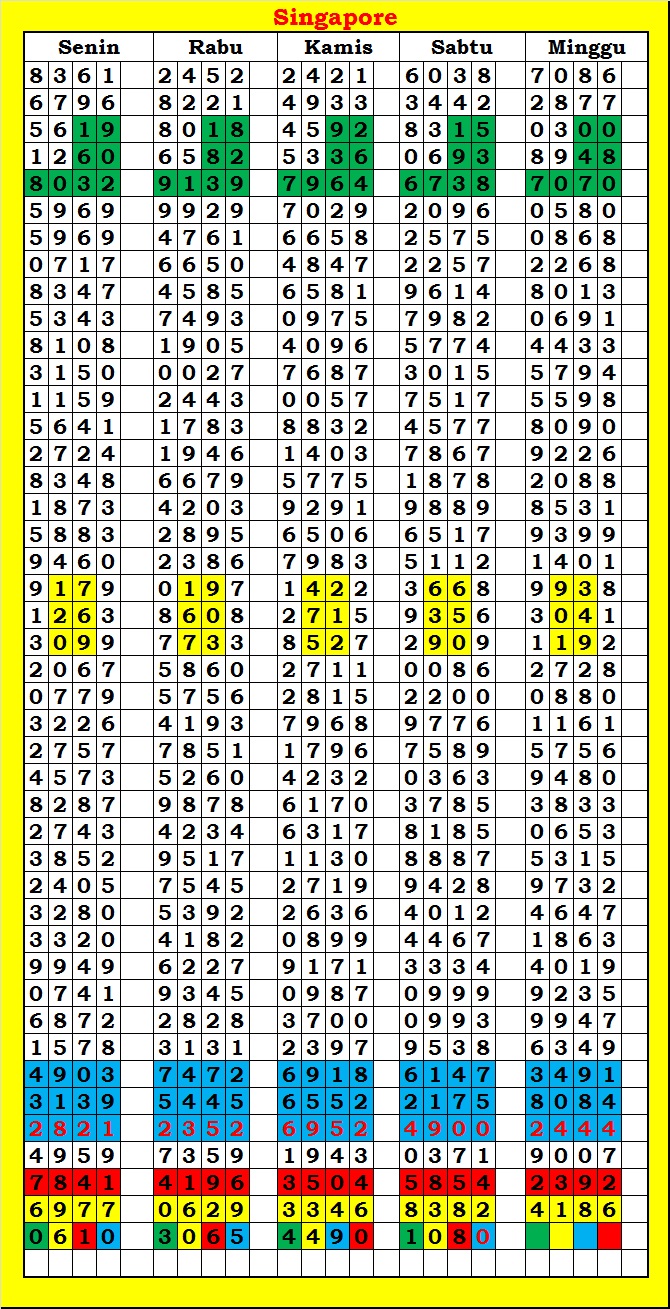 MASTER SINGAPURA Sabtu, 14-02-2026 Merupakan Prediksi Otomatis yang menggabungkan Metode Kalender Togel Dengan Rumus-rumus kontrol yang sudah terbukti keakuratanya.Gunakan Aplikasi Rekap untuk mendapatkan LN TOP. Harap Maklum Jika kadang meleset MASTER SINGAPURA kita. Jadikan ini sebagai perbandingan saja dan tetap UPS