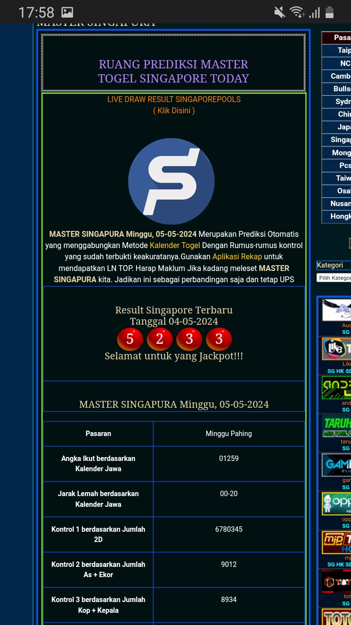 MASTER SINGAPURA Kamis, 12-02-2026 Merupakan Prediksi Otomatis yang menggabungkan Metode Kalender Togel Dengan Rumus-rumus kontrol yang sudah terbukti keakuratanya.Gunakan Aplikasi Rekap untuk mendapatkan LN TOP. Harap Maklum Jika kadang meleset MASTER SINGAPURA kita. Jadikan ini sebagai perbandingan saja dan tetap UPS