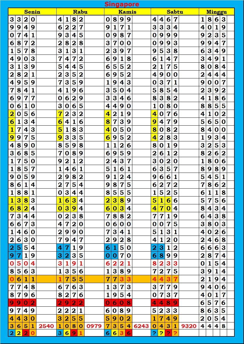 MASTER SINGAPURA Kamis, 12-02-2026 Merupakan Prediksi Otomatis yang menggabungkan Metode Kalender Togel Dengan Rumus-rumus kontrol yang sudah terbukti keakuratanya.Gunakan Aplikasi Rekap untuk mendapatkan LN TOP. Harap Maklum Jika kadang meleset MASTER SINGAPURA kita. Jadikan ini sebagai perbandingan saja dan tetap UPS