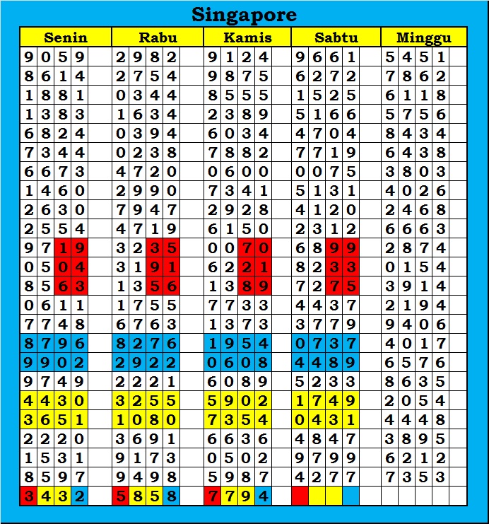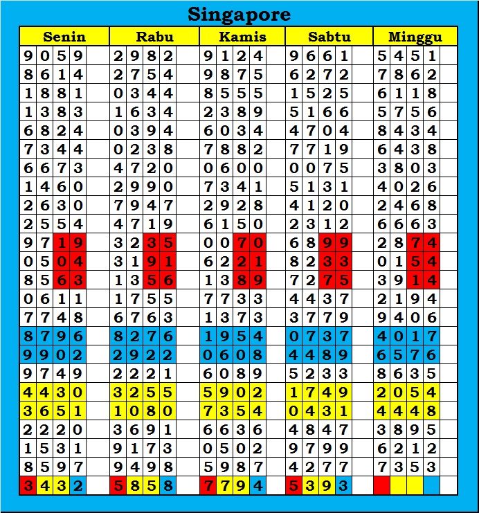 MASTER SINGAPURA Kamis, 12-02-2026 Merupakan Prediksi Otomatis yang menggabungkan Metode Kalender Togel Dengan Rumus-rumus kontrol yang sudah terbukti keakuratanya.Gunakan Aplikasi Rekap untuk mendapatkan LN TOP. Harap Maklum Jika kadang meleset MASTER SINGAPURA kita. Jadikan ini sebagai perbandingan saja dan tetap UPS