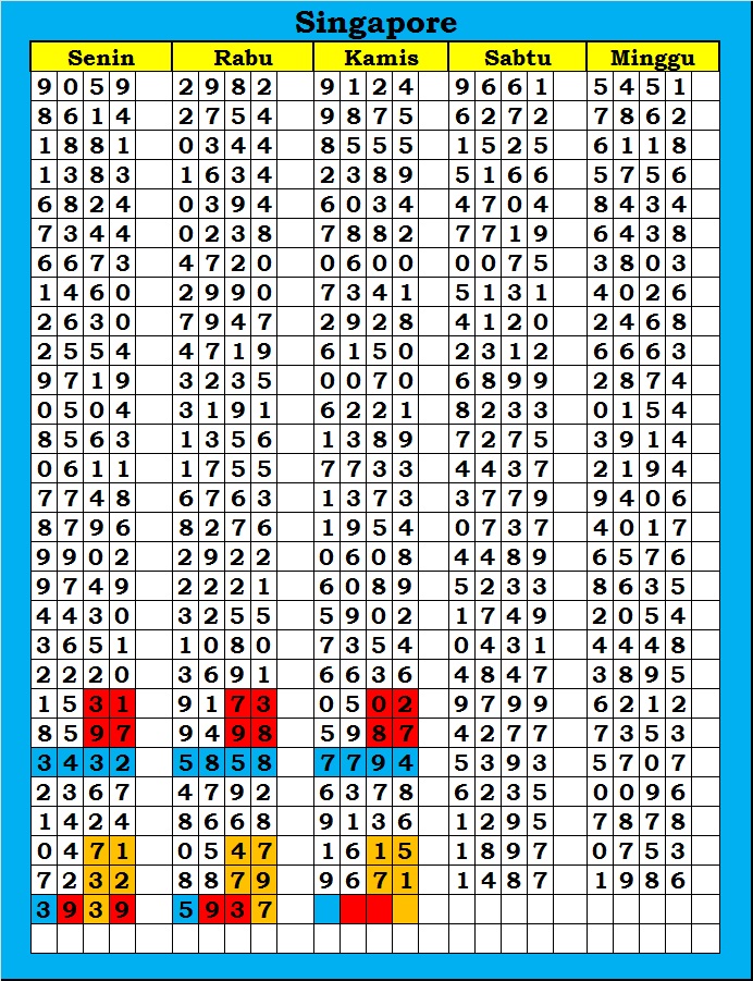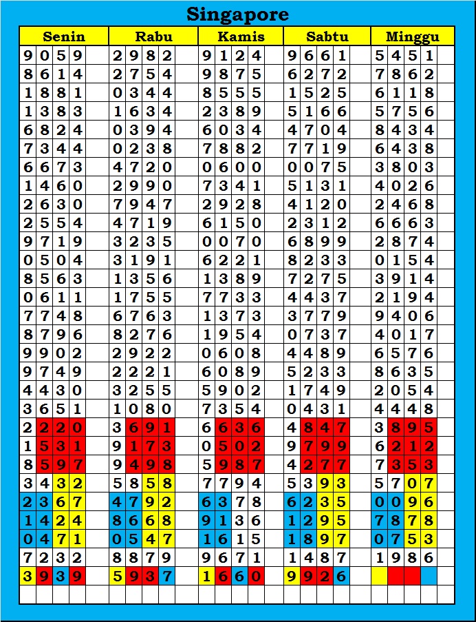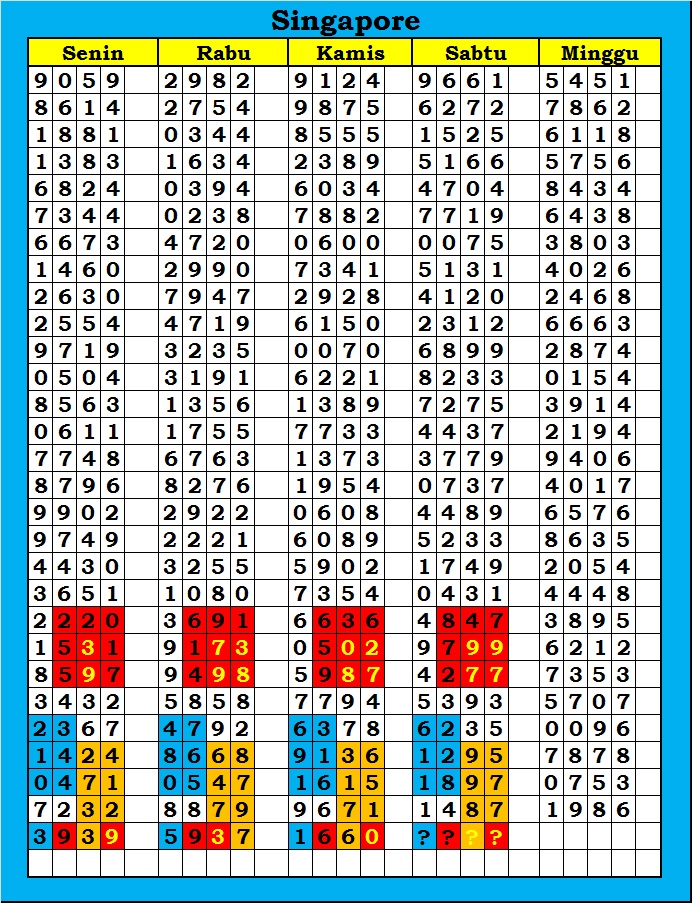 MASTER SINGAPURA Kamis, 12-02-2026 Merupakan Prediksi Otomatis yang menggabungkan Metode Kalender Togel Dengan Rumus-rumus kontrol yang sudah terbukti keakuratanya.Gunakan Aplikasi Rekap untuk mendapatkan LN TOP. Harap Maklum Jika kadang meleset MASTER SINGAPURA kita. Jadikan ini sebagai perbandingan saja dan tetap UPS