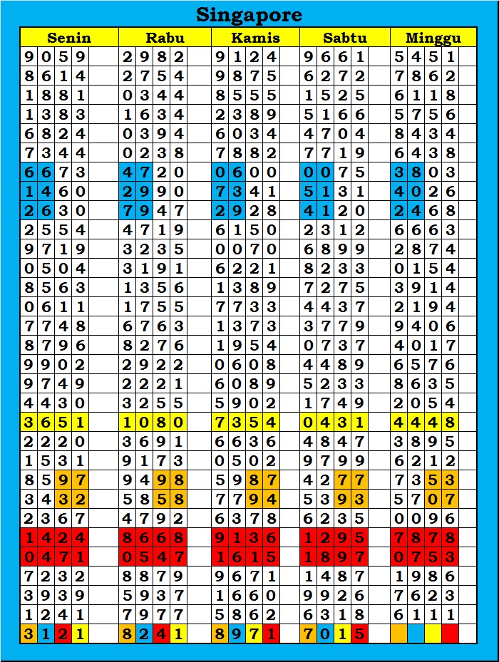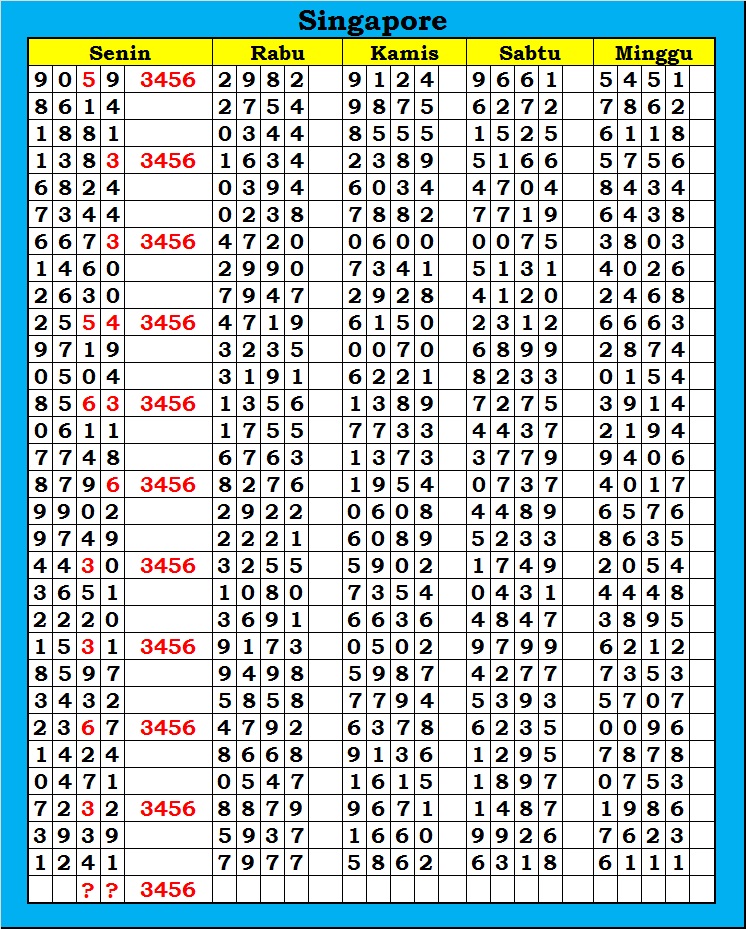 MASTER SINGAPURA Kamis, 12-02-2026 Merupakan Prediksi Otomatis yang menggabungkan Metode Kalender Togel Dengan Rumus-rumus kontrol yang sudah terbukti keakuratanya.Gunakan Aplikasi Rekap untuk mendapatkan LN TOP. Harap Maklum Jika kadang meleset MASTER SINGAPURA kita. Jadikan ini sebagai perbandingan saja dan tetap UPS