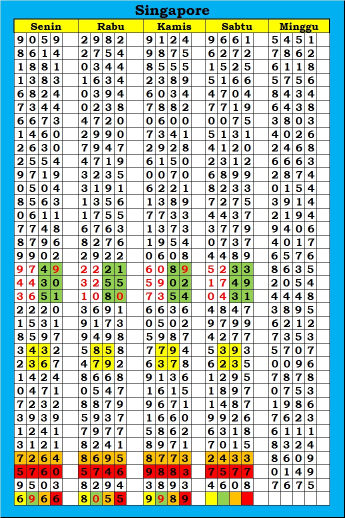MASTER SINGAPURA Kamis, 12-02-2026 Merupakan Prediksi Otomatis yang menggabungkan Metode Kalender Togel Dengan Rumus-rumus kontrol yang sudah terbukti keakuratanya.Gunakan Aplikasi Rekap untuk mendapatkan LN TOP. Harap Maklum Jika kadang meleset MASTER SINGAPURA kita. Jadikan ini sebagai perbandingan saja dan tetap UPS