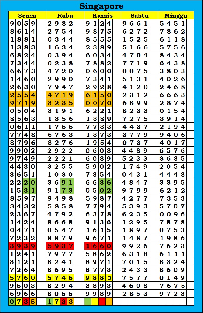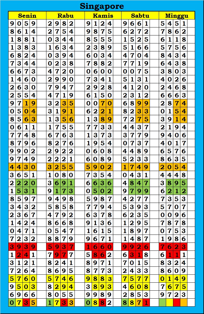 MASTER SINGAPURA Kamis, 12-02-2026 Merupakan Prediksi Otomatis yang menggabungkan Metode Kalender Togel Dengan Rumus-rumus kontrol yang sudah terbukti keakuratanya.Gunakan Aplikasi Rekap untuk mendapatkan LN TOP. Harap Maklum Jika kadang meleset MASTER SINGAPURA kita. Jadikan ini sebagai perbandingan saja dan tetap UPS