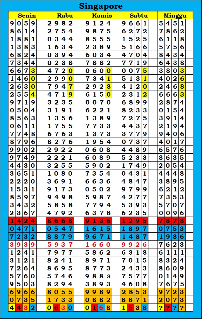 MASTER SINGAPURA Kamis, 12-02-2026 Merupakan Prediksi Otomatis yang menggabungkan Metode Kalender Togel Dengan Rumus-rumus kontrol yang sudah terbukti keakuratanya.Gunakan Aplikasi Rekap untuk mendapatkan LN TOP. Harap Maklum Jika kadang meleset MASTER SINGAPURA kita. Jadikan ini sebagai perbandingan saja dan tetap UPS