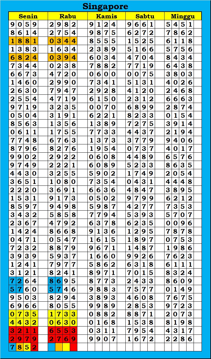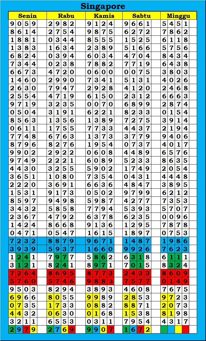 MASTER SINGAPURA Kamis, 12-02-2026 Merupakan Prediksi Otomatis yang menggabungkan Metode Kalender Togel Dengan Rumus-rumus kontrol yang sudah terbukti keakuratanya.Gunakan Aplikasi Rekap untuk mendapatkan LN TOP. Harap Maklum Jika kadang meleset MASTER SINGAPURA kita. Jadikan ini sebagai perbandingan saja dan tetap UPS