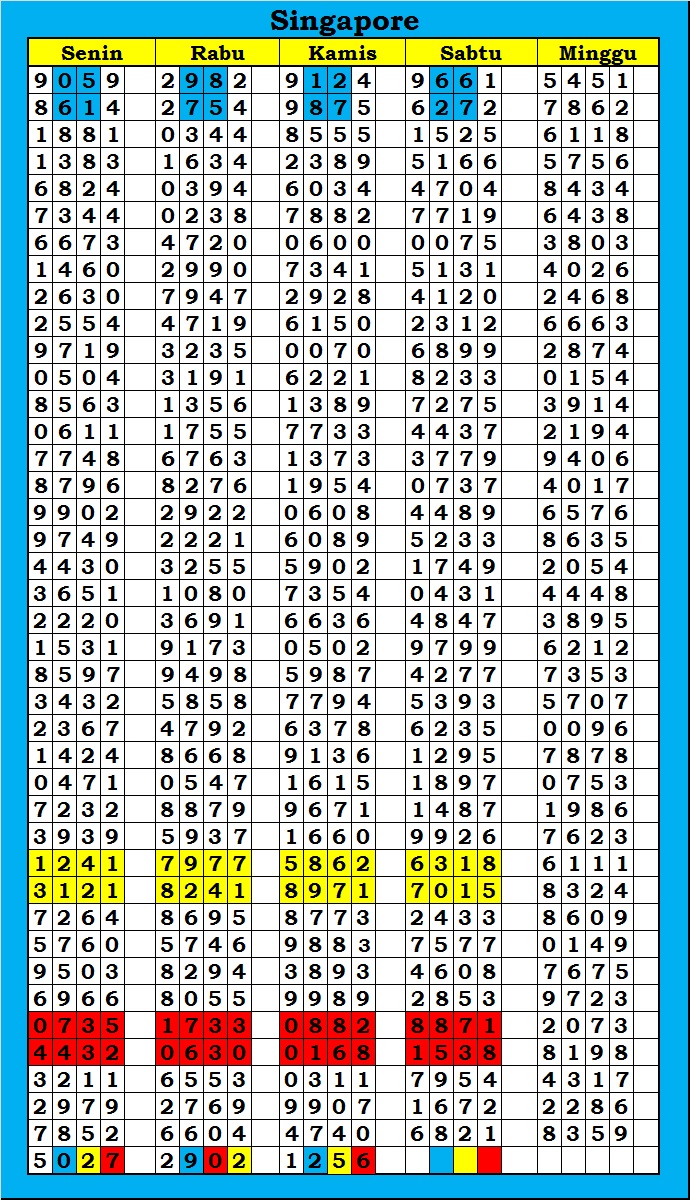 MASTER SINGAPURA Kamis, 12-02-2026 Merupakan Prediksi Otomatis yang menggabungkan Metode Kalender Togel Dengan Rumus-rumus kontrol yang sudah terbukti keakuratanya.Gunakan Aplikasi Rekap untuk mendapatkan LN TOP. Harap Maklum Jika kadang meleset MASTER SINGAPURA kita. Jadikan ini sebagai perbandingan saja dan tetap UPS